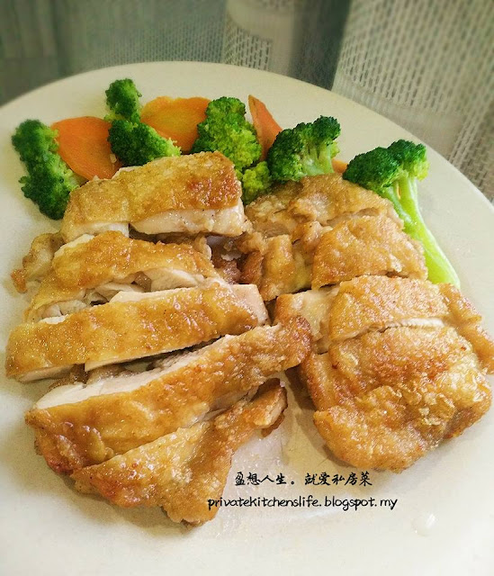 2.Use a non stick pan, preheat with 3 tablespoon oil. Apply some soy sauce on the chicken's skin and coated with Kentucky flour. Pan fry the chicken with the skin down under low medium heat for 2~3 minutes. 3.After 2~3 minutes flip the chicken to another side and continue to pan fry until golden brown color. Drained and set aside.